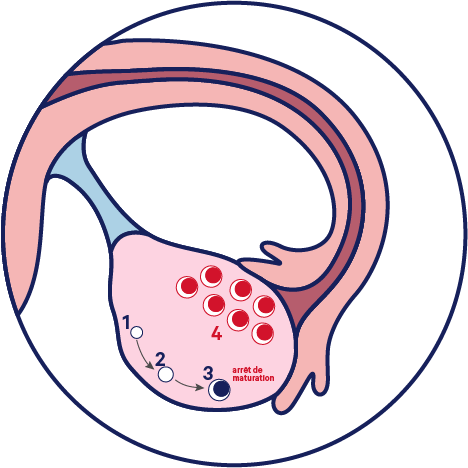 De nombreux follicules primordiaux sont activés, mais leur maturation s’arrête sans atteindre le stade de follicule de De Graaf.