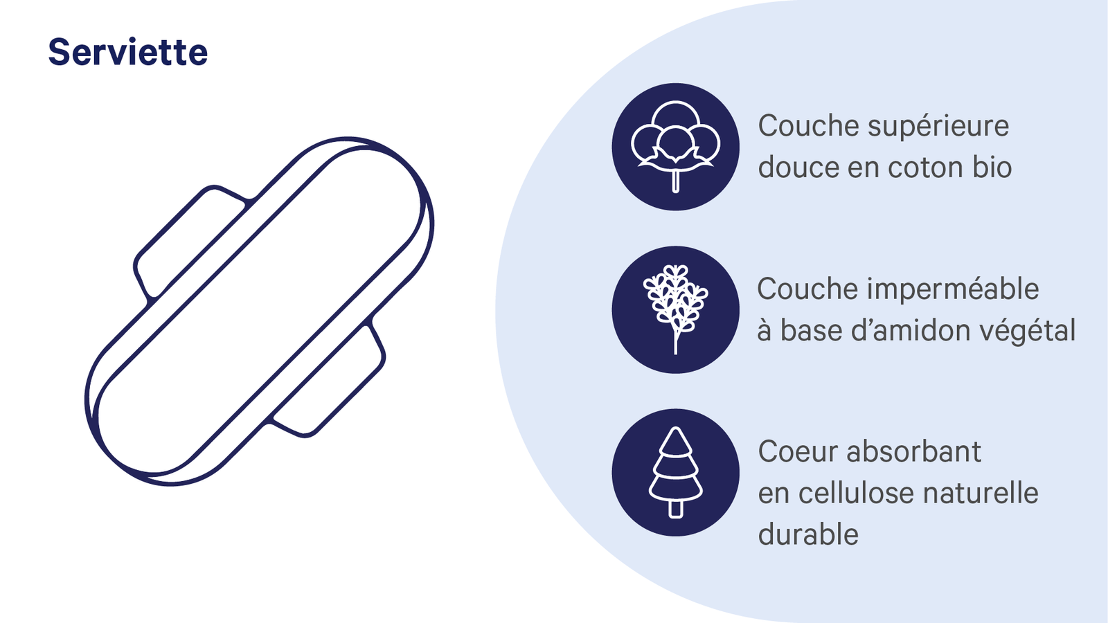 Si nos serviettes ne sont pas certifiées bio, elles n’en sont pas moins d’une excellente qualité ! La couche supérieure est en coton bio, le coeur absorbant en cellulose naturelle durable et la couche étanche en amidon végétal sans OGM.